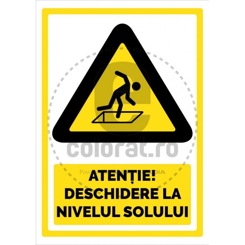 Indicator de securitate de avertizare imprimat pe suport autocolant vinyl si aplicat pe placa PVC (de 1 mm, 3 mm, 5 mm) sau dibond 3 mm (metalic, din aluminiu)