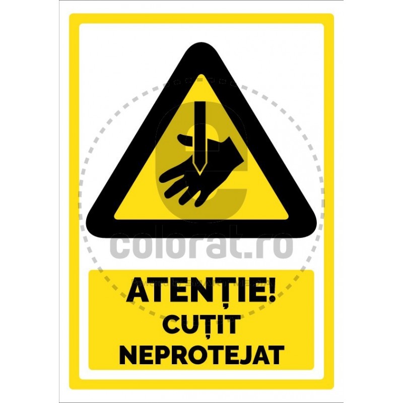 Indicator de securitate de avertizare imprimat pe suport autocolant vinyl si aplicat pe placa PVC (de 1 mm, 3 mm, 5 mm) sau dibond 3 mm (metalic, din aluminiu)