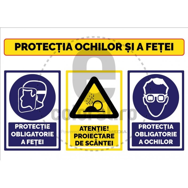 Indicator de securitate de avertizare imprimat pe suport autocolant vinyl si aplicat pe placa PVC (de 1 mm, 3 mm, 5 mm) sau dibond 3 mm (metalic, din aluminiu)